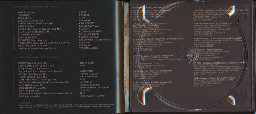 Жанр: Lounge Страна: Год издания: 2014 Формат издания: 2xCD, Compilation, Mixed Издательство: Seamless Recordings Каталоговый номер: MEERCD040 Аудиокодек: FLAC (*.flac) Формат аудиофайлов: tracks+.cue Продолжительность: 02:24:30 Источник материала: oleandris Наличие полиграфии: да Треклист: CD1 (Dia): 01. Kargo - Enter Djemma (0:47) 02. Graddus - Novbahor (7:01) 03. T_Mo - Come Alive (3:46) 04. Caravane - Bestana (Atalanta Mix) (5:41) 05. Kaya Project - Desert Phase (Hibernation Mix) (5:27) 06. Carlos Cervilla - Arabia Dream (4:32) 07. Eccodek - Bizuru Dub (Eccodek Stepper’S Dub Mix) (4:55) 08. Florzinho & Cambis - Aman Aman (Instrumental Mix) (5:22) 09. DZihan & Kamien - Slowhand Hussein (5:12) 10. Liquid Stranger - Djarum Express (6:32) 11. Kaya Project & Interpulse - 23 Towers (Interpulse Mix) (6:09) 12. Eccodek - Voices Have Eyes (Dubmatix Cinematic Dub Mix) (4:47) 13. Caravane - Imout Rih (Chris Coco Mix) (6:00) 14. The Normalites - The Sun Rising (Shur-I-Kan Dub Mix) (6:27) CD2 (Noche): 01. Ben La Desh - Rendez-Vous (Original Mix) (6:55) 02. Powel - I Don't Waste My Tears On You (Lake People Tell Me Now Mix) (5:30) 03. Moodymanc - Black Paint (Larry Heard's After Dark Mix) (6:24) 04. The White Lamp - It's You (Ron Basejam Mix) (5:48) 05. Wiki & Oneplus - Third Floor (Original Mix) (6:24) 06. Guri - Something About You (Original Mix) (4:46) 07. Ian Pooley - Groove Me (Matthew Dekay & Lee Burridge Mix) (7:14) 08. Michael Jansons - All I Give (Original Mix) (4:56) 09. Sebas Ramis & J.M.Aboga - Sandstorm (Original Mix) (5:12) 10. Chymera - Wish (Original Mix) (5:44) 11. 33Hz - Stephanie All Night (Whatever/Whatever Dub Mix) (6:42) 12. Rodriguez Jr. & And.Id - Roads (Original Mix) (6:15)