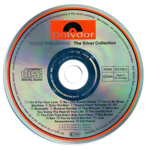 "Always Proper, Ever SelfMade"Toots Thielemans - The Silver Collection - 1974 Жанр: Bop, Mainstream Jazz, Latin Jazz Страна исполнителя: Belgium Страна - производитель диска: West Germany Год издания: 1974 Год переиздания: 1985 Издатель (лейбл): Polydor Номер по каталогу: 825 086-2 Тип: CD, Album, Compilation Аудио кодек: FLAC (*.flac) Тип рипа: (tracks + .cue) Битрейт аудио: lossless Наличие сканов в содержимом раздачи: full scans, png, 300 dpi Продолжительность: 63:30 Источник (релизер): коллекция Zavit'a, мой рип Трэклист: 1. I Do It For Your Love (3:32) (P. Simon)