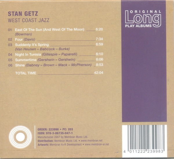 REM GENRE Jazz REM DATE 2007 REM DISCID 5409DC06 REM COMMENT "ExactAudioCopy v1.3" PERFORMER "Stan Getz" TITLE "West Coast Jazz" REM COMPOSER "" FILE "01. East Of The Sun (And West Of The Moon).wav" WAVE TRACK 01 AUDIO TITLE "East Of The Sun (And West Of The Moon)" PERFORMER "Stan Getz" REM COMPOSER "" ISRC DEU240557694 FLAGS DCP INDEX 01 00:00:00 FILE "02. Four.wav" WAVE TRACK 02 AUDIO TITLE "Four" PERFORMER "Stan Getz" REM COMPOSER "" ISRC DEU240557695 FLAGS DCP INDEX 01 00:00:00 FILE "03. Suddenly It's Spring.wav" WAVE TRACK 03 AUDIO TITLE "Suddenly It's Spring" PERFORMER "Stan Getz" REM COMPOSER "" ISRC DEU240557696 FLAGS DCP INDEX 01 00:00:00 FILE "04. Night In Tunisia.wav" WAVE TRACK 04 AUDIO TITLE "Night In Tunisia" PERFORMER "Stan Getz" REM COMPOSER "" ISRC DEU240557697 FLAGS DCP INDEX 01 00:00:00 FILE "05. Summertime.wav" WAVE TRACK 05 AUDIO TITLE "Summertime" PERFORMER "Stan Getz" REM COMPOSER "" ISRC DEU240557698 FLAGS DCP INDEX 01 00:00:00 FILE "06. Shine.wav" WAVE TRACK 06 AUDIO TITLE "Shine" PERFORMER "Stan Getz" REM COMPOSER "" ISRC DEU240557699 FLAGS DCP INDEX 01 00:00:00