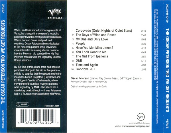 Самое замечательное в Оскаре Питерсоне — то, что он играет для людей. Это может показаться не таким уж замечательным, пока не задумаешься. Самое замечательное в Оскаре Питерсоне — то, что, играя для людей, он не идёт ни на какие компромиссы в своём искусстве. Это невероятно здорово. Подумайте обо всех музыкантах, которых вы слышали, которые звучат так, будто играют только для других музыкантов. Они демонстрируют виртуозное мастерство, чтобы порадовать горстку музыкантов, или, что ещё хуже, играют так, словно бросают вызов конкурентам, чтобы посоревноваться в мастерстве. В любом случае, отношение к публике таково: плевать на публику. Когда Оскар Питерсон демонстрирует виртуозное мастерство — а он делает это практически в каждом концерте — публика и музыканты восхищаются его техникой. А когда он откладывает в сторону своё ослепительное владение фортепиано, чтобы сыграть мелодию с теплотой и проникновенностью, публика и музыканты снова понимают и ценят глубину смысла в его мелодической интерпретации. Он привлекателен для всех, потому что он мастер коммуникации, и он общается как на эмоциональном, так и на техническом уровне. «We Get Requests» — прекрасный пример удивительной двусторонности Оскара Питерсона. С технической точки зрения альбом отличается мелодическим развитием выше среднего и прочным ритмическим миксом, а репертуар — сплошной восторг. На этом лонгплее слушатель наслаждается изысканным миксом современных поп-мелодий, стандартных и оригинальных композиций. Именно это разнообразие, особенно с включением недавних популярных хитов, лучше всего иллюстрирует тему «We Get Requests» этого альбома. Оскар Питерсон играл и продолжает играть по заявкам в клубах по всей стране, в таких ночных заведениях, как Basin Street East в Нью-Йорке и London House в Чикаго. Конечно, он не барный пианист и вежливо откажет пьянице за столиком номер 10, который попросит «Melancholy Baby», но любая разумная просьба, высказанная в духе дружелюбия и взаимного уважения, обычно выполняется. Оскар сообщает, что в последние месяцы трио часто приглашали исполнить несколько хитов, и тот факт, что он считает их достойными исполнения и включения в этот альбом, многое говорит о повышении качества вкуса современной публики. Среди недавних хитов, которые Питерсон обработал в этом альбоме, – прекрасная композиция Джонни Мерсера и Генри Манчини «Days of Wine And Roses»; песня Барбры Стрейзанд из бродвейского мюзикла «Смешная девчонка» «People»; хит Стэна Гетца и Аструд Жилберту «The Girl From Ipanema»; и прекрасная композиция Антонио Карлоса Жобима «Corcovado», которая также представлена здесь с английским названием «Quiet Nights of Quiet Stars». Наряду со стандартными композициями «Have You Met Miss Jones?» и «My One and Only Love» в альбоме звучат мелодии Джона Льюиса из Modern Jazz Quartet «D&E», оригинальная композиция Стаффа Смита «Time and Again» и оригинальная композиция самого пианиста «Goodbye, J.D». Можно сказать, что последняя композиция — это дань уважения коллеге, ведь она посвящена Джиму Дэвису, продюсеру Verve A&R, работавшему над проектом Oscar. Как и на других альбомах Verve, пианист Петерсон играет в окружении своего постоянного состава: двух лучших профессиональных музыкантов современности, играющих на своих инструментах: басиста Рэя Брауна и барабанщика Эда Тигпена. Каждый из них вносит неоценимый вклад в общее превосходство альбома. В серии «We Get