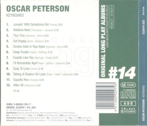 REM GENRE Jazz REM DATE 2005 REM DISCID 9408D40C REM COMMENT "ExactAudioCopy v1.3" PERFORMER "Oscar Peterson" TITLE "Keyboard" REM COMPOSER "" FILE "01. Jumpin' With Symphony Sid.wav" WAVE TRACK 01 AUDIO TITLE "Jumpin' With Symphony Sid" PERFORMER "Oscar Peterson" REM COMPOSER "" ISRC DEU240553989 FLAGS DCP INDEX 01 00:00:00 FILE "02. Robbins Nest.wav" WAVE TRACK 02 AUDIO TITLE "Robbins Nest" PERFORMER "Oscar Peterson" REM COMPOSER "" ISRC DEU240553990 FLAGS DCP INDEX 01 00:00:00 FILE "03. Tico Tico.wav" WAVE TRACK 03 AUDIO TITLE "Tico Tico" PERFORMER "Oscar Peterson" REM COMPOSER "" ISRC DEU240553991 FLAGS DCP INDEX 01 00:00:00 FILE "04. Get Happy.wav" WAVE TRACK 04 AUDIO TITLE "Get Happy" PERFORMER "Oscar Peterson" REM COMPOSER "" ISRC DEU240553992 FLAGS DCP INDEX 01 00:00:00 FILE "05. Smoke Gets In Your Eyes.wav" WAVE TRACK 05 AUDIO TITLE "Smoke Gets In Your Eyes" PERFORMER "Oscar Peterson" REM COMPOSER "" ISRC DEU240553993 FLAGS DCP INDEX 01 00:00:00 FILE "06. Deep Purple.wav" WAVE TRACK 06 AUDIO TITLE "Deep Purple" PERFORMER "Oscar Peterson" REM COMPOSER "" ISRC DEU240553994 FLAGS DCP INDEX 01 00:00:00 FILE "07. Exactly Like You.wav" WAVE TRACK 07 AUDIO TITLE "Exactly Like You" PERFORMER "Oscar Peterson" REM COMPOSER "" ISRC DEU240553995 FLAGS DCP INDEX 01 00:00:00 FILE "08. I'll Remember April.wav" WAVE TRACK 08 AUDIO TITLE "I'll Remember April" PERFORMER "Oscar Peterson" REM COMPOSER "" ISRC DEU240553996 FLAGS DCP INDEX 01 00:00:00 FILE "09. Easy To Love.wav" WAVE TRACK 09 AUDIO TITLE "Easy To Love" PERFORMER "Oscar Peterson" REM COMPOSER "" ISRC DEU240553997 FLAGS DCP INDEX 01 00:00:00 FILE "10. Taking A Chance On Love.wav" WAVE TRACK 10 AUDIO TITLE "Taking A Chance On Love" PERFORMER "Oscar Peterson" REM COMPOSER "" ISRC DEU240553998 FLAGS DCP INDEX 01 00:00:00 FILE "11. Squatty Roo.wav" WAVE TRACK 11 AUDIO TITLE "Squatty Roo" PERFORMER "Oscar Peterson" REM COMPOSER "" ISRC DEU240553999 FLAGS DCP INDEX 01 00:00:00 FILE "12. After All.wav" WAVE TRACK 12 AUDIO TITLE "After All" PERFORMER "Oscar Peterson" REM COMPOSER "" ISRC DEU240554000 FLAGS DCP INDEX 01 00:00:00